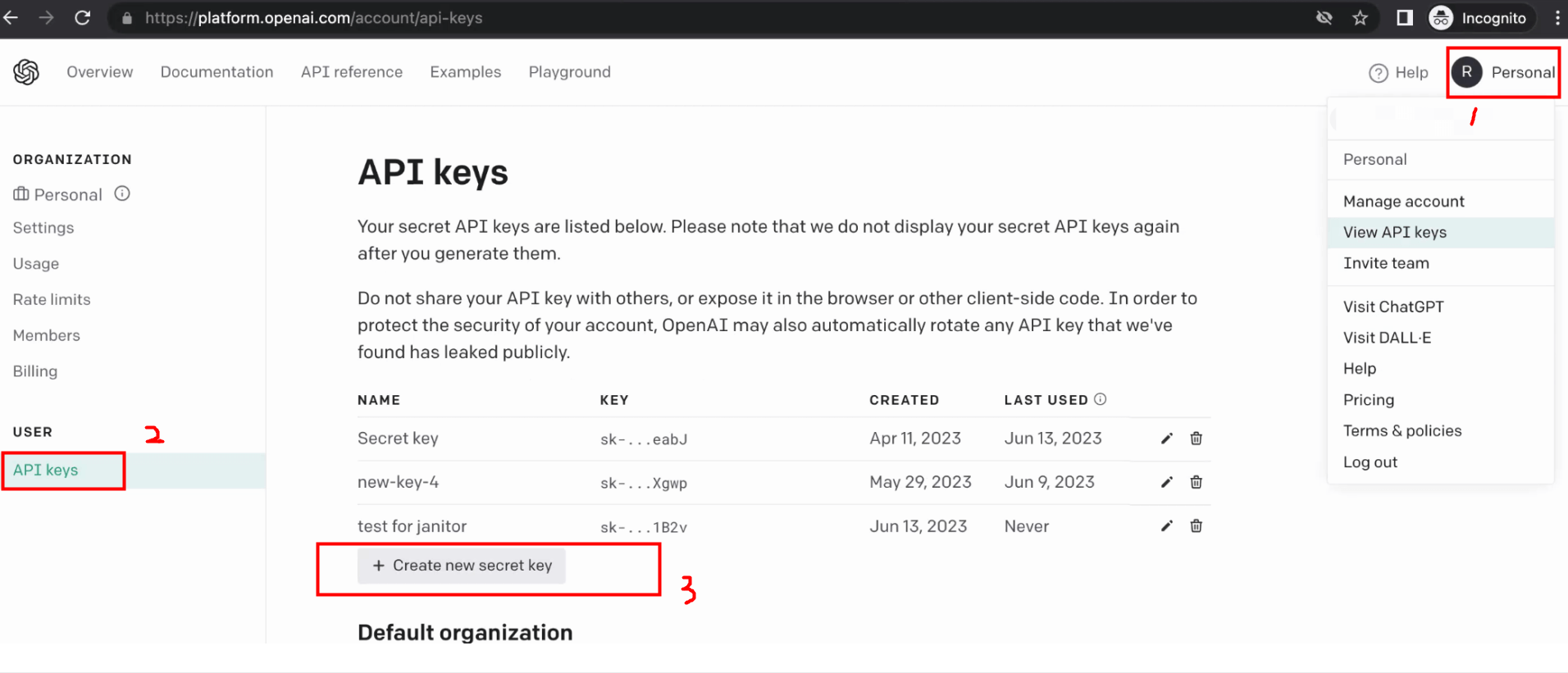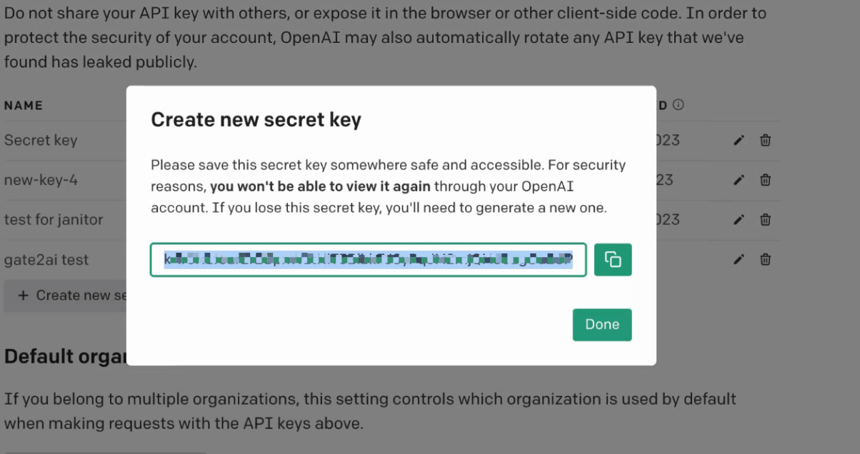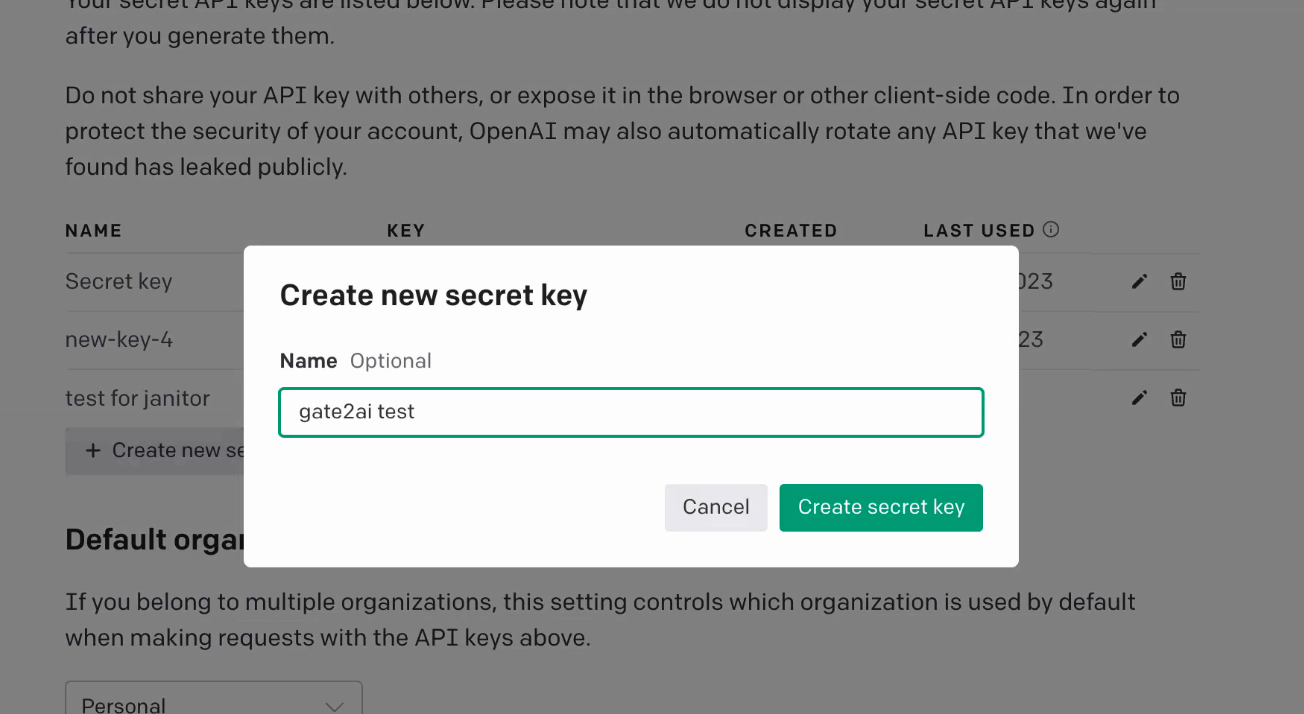 - Đặt tên cho secret key mới và nhấp lại vào Create new secret key again để nhận API.