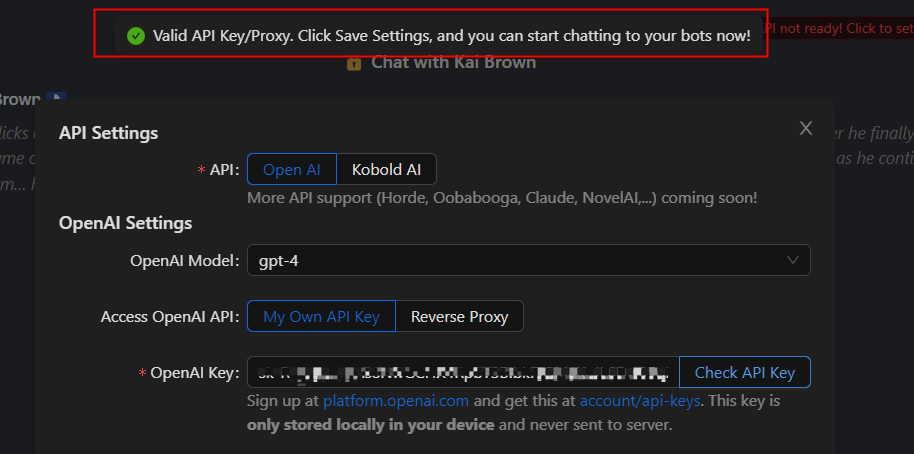 Bây giờ, nó hiển thị API key hợp lệ. Nhấp vào Save Settings và bạn có thể bắt đầu trò chuyện với bot ngay bây giờ!