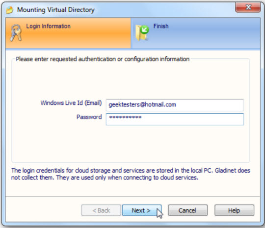 Gladinet hỗ trợ nhiều tài khoản lưu trữ trực tuyến đa dạng mà bạn có thể sử dụng. Ở đây, chúng tôi sẽ tích hợp tài khoản Windows Live SkyDrive, chọn tiếp Next để tiếp tục:
