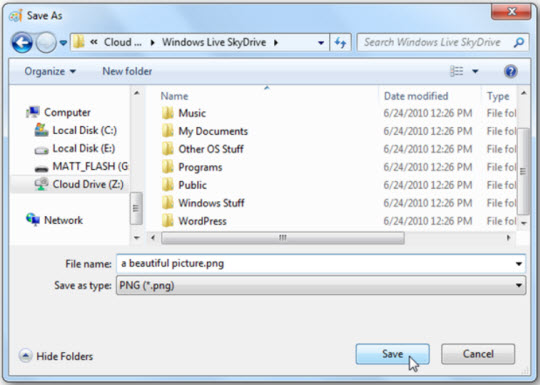 Bên cạnh đó, bạn cũng có thể lựa chọn SkyDrive là thư mục lưu dữ liệu trực tiếp từ bất cứ chương trình nào: