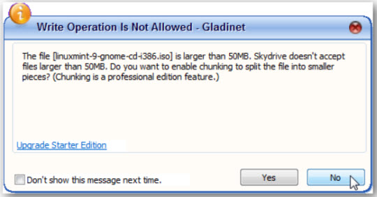 1 điểm lưu ý khác rằng SkyDrive chỉ cho phép dung lượng tối đa mỗi file là 50Mb, nếu bạn tải file với kích thước lớn hơn, SkyDrive sẽ tự động chia nhỏ file đó. Tuy nhiên, tính năng này chỉ có ở phiên bản Professional, còn với phiên bản Free thì người dùng phải tự chia nhỏ file dữ liệu trước khi tải lên SkyDriver: