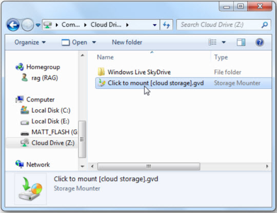 Gladinet không giới hạn các tài khoản lưu trữ trực tuyến, vì vậy bạn có thể thêm và sử dụng nhiều tài khoản cùng 1 lúc. Để làm việc này, chọn ổ networked drive (thông thường là ổ Z:\) và kích đúp vào đường dẫn Click to mount [cloud storage]: