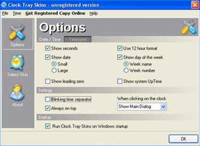 Trong hộp thoại này, ở khung bên trái bạn chọn Options để xác lập các thông số (tại khung bên phải) như: hiển thị giây (Show seconds), dùng định dạng 12h (Use 12 hour format), hiển thị ngày (Show date), làm cho dấu phân cách nhấp nháy (Blinking time separator)…