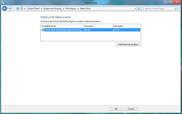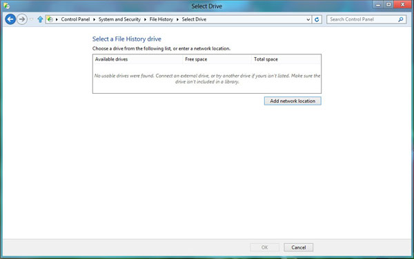 Hộp thoại Select a File History Drive mở ra. Chọn Add network location.