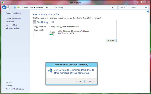 Nếu PC chạy Windows 8 thuộc một HomeGroup, File History sẽ gợi ý sử dụng địa điểm lưu trữ bạn đã lập cho các thành viên khác trong HomeGroup. Nếu không muốn điều này, chỉ cần nhấn No để bỏ qua.