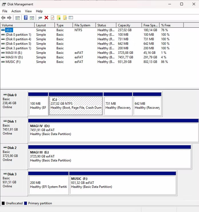 Khi mở Disk Management trong Windows, bạn sẽ thấy chữ “Healthy” xuất hiện ở nhiều vị trí trên sơ đồ ổ đĩa. Tuy nhiên, trạng thái này chỉ phản ánh tính toàn vẹn của cấu trúc dữ liệu, chứ không phải tình trạng vật lý của ổ.