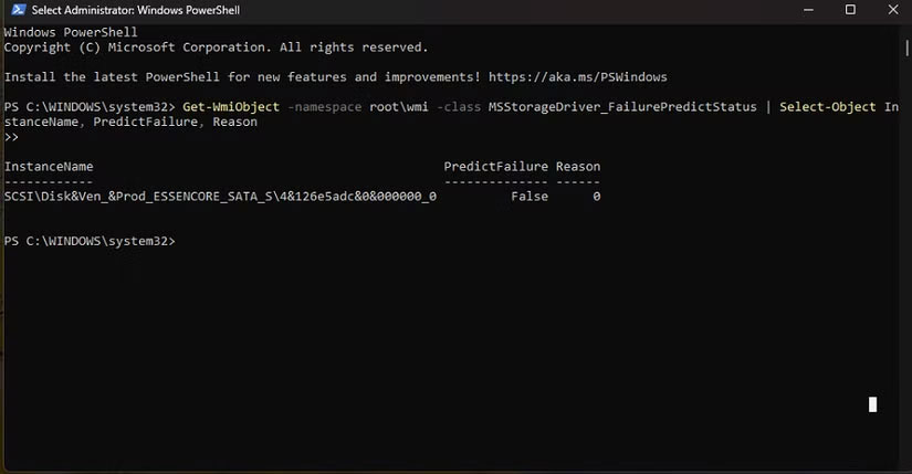 Get-WmiObject -namespace root\wmi -class MSStorageDriver_FailurePredictStatus | Select-Object InstanceName, PredictFailure, Reason