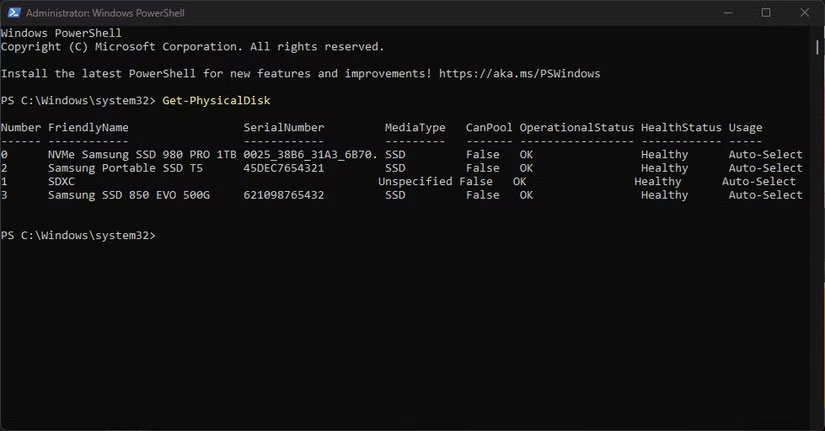 Lệnh này sẽ hiển thị danh sách các ổ đĩa vật lý đang gắn trên máy. Thông tin quan trọng ở đây là “FriendlyName”, vì bạn sẽ dùng tên này để truy xuất dữ liệu chi tiết của ổ cần kiểm tra. Ví dụ, trong trường hợp này là ổ Samsung 980 Pro dùng làm ổ hệ điều hành.