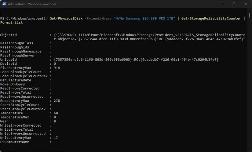 Bạn cần thay tên ổ cho đúng với SSD của mình. Nếu nhập chính xác, PowerShell sẽ hiển thị hàng loạt thông số.