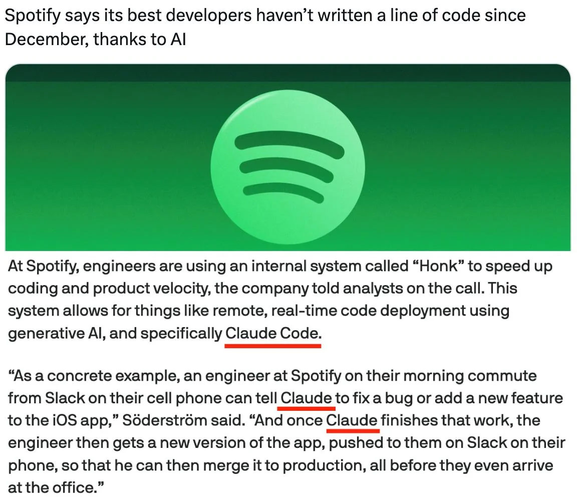 Tại Spotify, các kỹ sư đang sử dụng một hệ thống nội bộ có tên “Honk” nhằm đẩy nhanh quá trình viết code và triển khai sản phẩm. Theo chia sẻ với giới phân tích, hệ thống này cho phép triển khai mã từ xa theo thời gian thực nhờ AI tạo sinh, cụ thể là Claude Code.