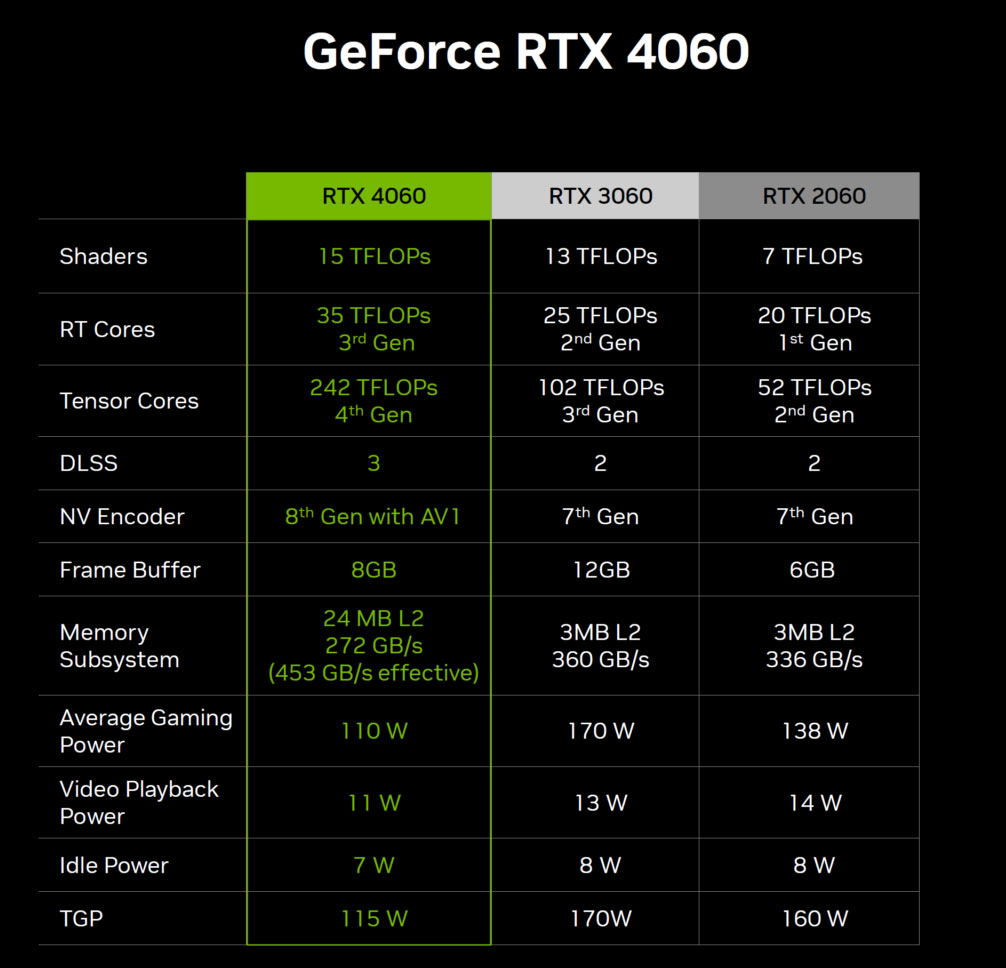 Cũng cần lưu ý rằng NVIDIA GeForce RTX 4060 sẽ có TGP thấp hơn 35% so với người tiền nhiệm RTX 3060 12GB. Card được cho là có TGP 115W nhưng mức tiêu thụ năng lượng trong chơi game thực tế phải vào khoảng 110W, với công suất nhàn rỗi được định mức là 7W và công suất phát video khoảng 11W.