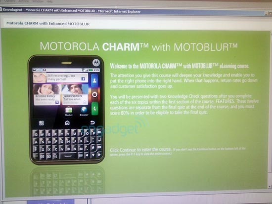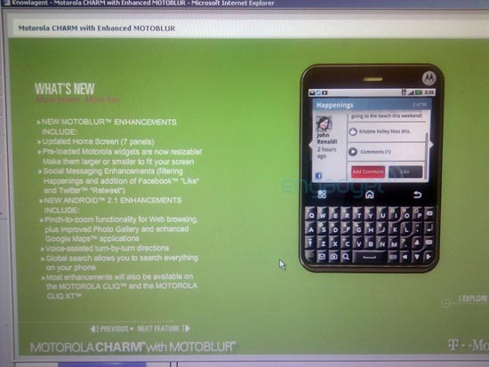 Motorola đã quay trở lại thật ấn tượng với dòng điện thoại Android của mình. Hàng loạt điện thoại mới được hãng tung ra nhằm vào nhiều thị trường và đáp ứng nhiều nhu cầu khác nhau của người sử dụng. Motorola Charm sẽ là chú Android dạng thanh bar và có bàn phím QWERTY, có khả năng thu hút được sự chú ý của những người trung thành với Palm và Blackberry.
