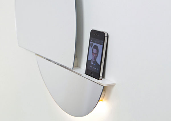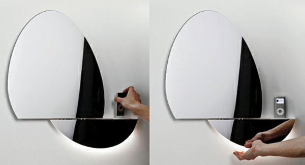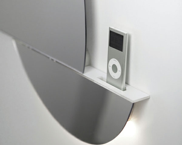 Open Mirror có thiết kế như một chiếc gương treo tường nhưng kèm dock sạc và loa cho iPhone/iPod.