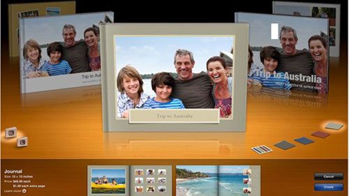 iPhoto sẽ bố trí tính năng tạo sách ảnh ngay trên màn hình desktop. Sẽ có nhiều mẫu mặc định (template) với nhiều chủ đề khác nhau, cho phép bạn lựa chọn màu nền, font chữ, maquette... Bạn thậm chí còn có thể đưa ảnh tràn ra đến tận rìa trang để tạo ra hiệu ứng ảnh-hai-trang cỡ đại nữa.