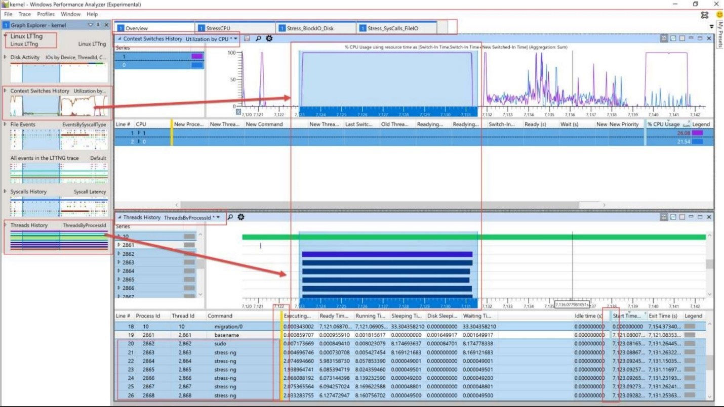 - LTTng (Linux Kernel CPU scheduling, Processes, Threads, Block IO/Disk, Syscalls, File event, etc, v.v.)