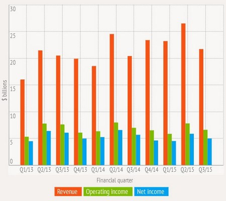 Trong 3 tháng thuộc quý III/2015 (theo năm tài khóa của công ty), Microsoft đã đạt được khoản lợi nhuận 4,98 tỷ USD trên tổng mức doanh thu 21,7 tỷ USD. Doanh thu này đã tăng hơn 6%, tuy nhiên lợi nhuận lại sụt giảm 12% so với cùng kỳ năm ngoái. Lợi nhuận cổ phiếu đạt 0,61USD/cổ phiếu, cao hơn mức 0,51USD/cổ phiếu được dự đoán trước đó.