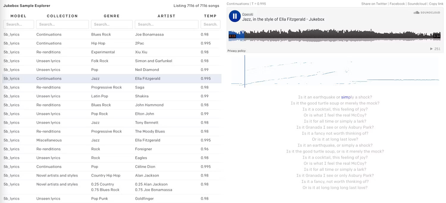 Hoặc, bạn có thể ghé qua Jukebox Sample Explorer. Đây là nơi OpenAI đăng tải các thử nghiệm của mình từ việc tạo những bài hát giống như Ella Fitzgerald hay 2Pac.