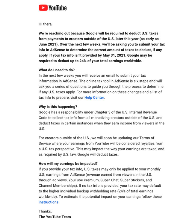 Mới đây, các kênh Youtube tại Việt Nam đã nhận được thông báo về chính sách thuế mới của chính phủ Mỹ. Chính sách thuế mới này khiến cho nhiều YouTuber tại Việt Nam không khỏi hoang mang.
