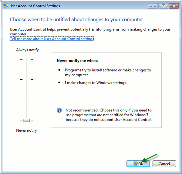 Kéo thanh trượt xuống lựa chọn cuối cùng Never notify, sau đó nhấn OK:
