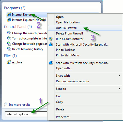 Giả sử rằng, chúng ta sẽ gán ứng dụng Internet Explorer vào Firewall và chặn chương trình này. Tìm Internet Explorer từ Start Menu, nhấn chuột phải và chọn Add To Firewall: