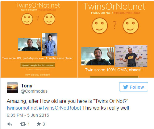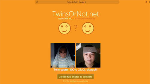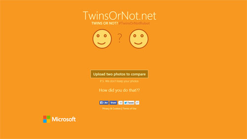 Chắc hẳn bạn vẫn chưa quên how-old.net, trang web được Microsoft xây dựng nhằm minh họa cho thư viện nhận diện khuôn mặt của mình. Một trang web với mục đích tương tự mang tên "Twins Or Not?" cũng đã được lập nên, cho phép bạn nhật biết khuôn mặt trong 2 bức ảnh có phải là cùng một người hay không.