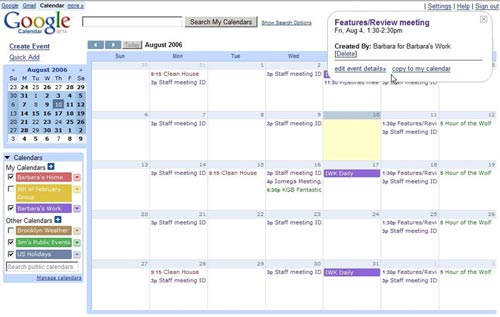 Điều tuyệt nhất ở Google Calendar là tính thông minh và dễ hiểu khi xử lý các bộ lịch chia sẻ. Bạn có thể thêm bao nhiêu lịch iCal hay lịch chia sẻ riêng tư cũng được. Google sẽ lập danh sách tất cả chúng trên cửa sổ chương trình. Sau đó bạn có thể kiểm tra lịch bạn muốn tại bất kỳ lúc nào. Điều đó có nghĩa là bạn có thể load từng lịch đã được chia sẻ bạn cần mà không cần nhồi nhét tất cả chúng lên màn hình trong một lần mở ra. Chẳng hạn bạn có thể không kiểm tra lịch với lũ trẻ nhà bạn mà chỉ cần xem các buổi hẹn kinh doanh của mình.