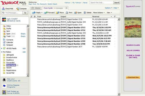 Yahoo Mail sử dụng phương thức tổ chức folder truyền thống. Với Ajax, bây giờ bạn có thể dùng chức năng drag-to-drop (kéo-thả) để di chuyển e-mail. Một chức năng bổ sung với các trang được phân thành từng tab, và tất nhiên khi đó bạn có thể mở cùng một lúc nhiều e-mail và dễ dàng chuyển từ e-mail này đến e-mail khác. Giao diện này của Yahoo nặng về quảng cáo hơn của Google và những quảng cáo đó có trật tự chứ không quá tràn lan. Với Yahoo bạn cũng có thể thiết lập một số tính năng lọc thư và trả lời tự động. Thêm nữa, Yahoo Mail chỉ có 1GB lưu trữ, trong khi Gmail thì có tới 2,5 GB.