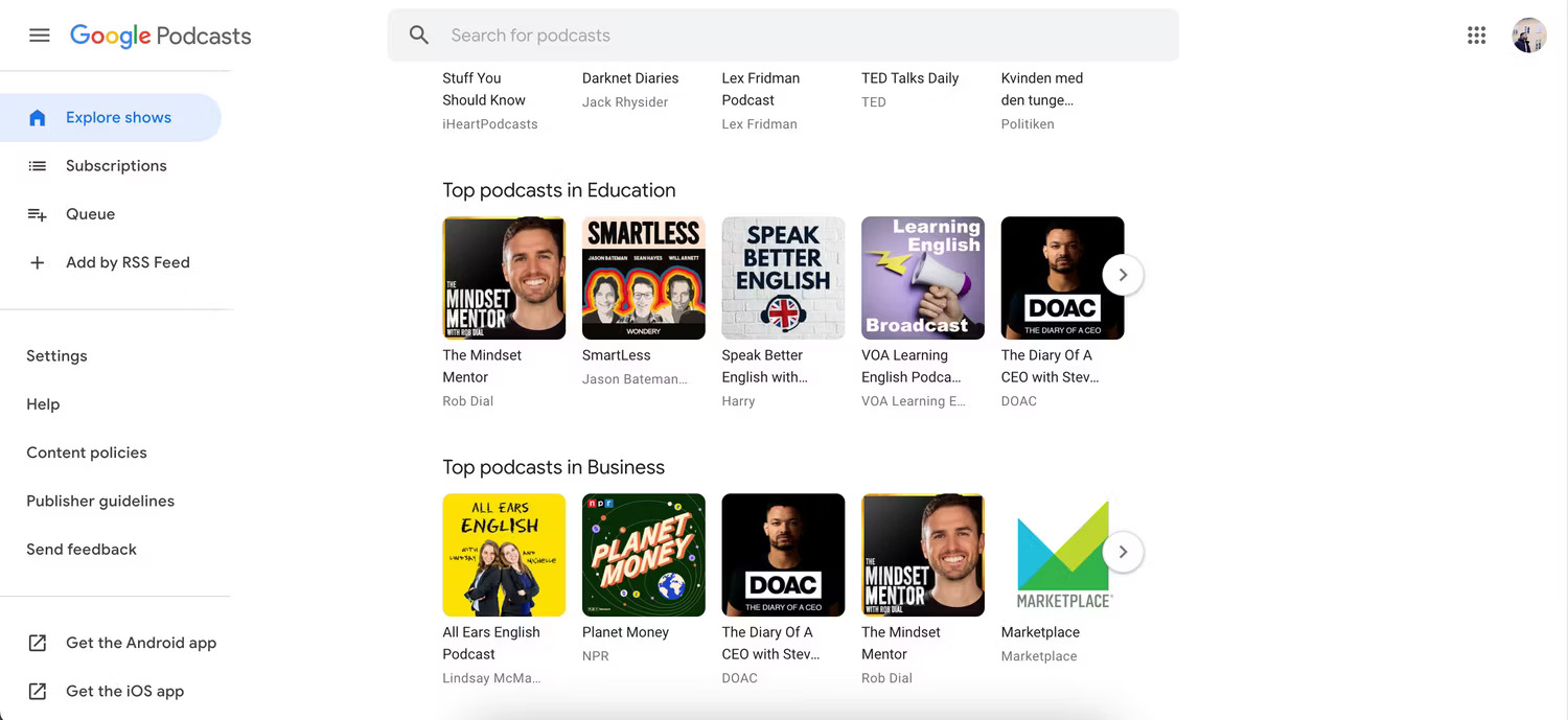 Podcast đã phát triển theo cấp số nhân vào cuối những năm 2010 và đầu những năm 2020. Google Podcasts là nỗ lực của công ty để sánh ngang với Spotify và Apple Music. Google Podcasts lần đầu ra mắt vào tháng 8 năm 2018 và bạn có thể tìm thấy nhiều chương trình thú vị trên nền tảng này. Các ví dụ bao gồm Deep Dive With Ali Abdaal và Diary of a CEO của Steven Bartlett.