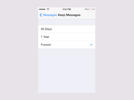 Tin nhắn là một trong những nguyên nhân khiến dung lượng lưu trữ thiết bị iOS nhanh cạn kiệt, đặc biệt là khi bạn gửi và nhận nhiều hình ảnh. Để tránh tình trạng này, bạn có thể thiết lập để iOS tự động xóa tin nhắn trong vòng một khoảng thời gian cố định, chẳng hạn sau 30 ngày, hay thậm chí có thể sau một năm. Hãy vào mục Settings --> Messages --> Keep Messages và chọn một tùy chọn phù hợp với bạn.