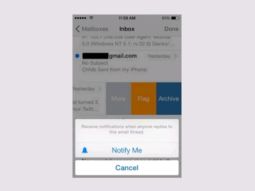 Nếu vừa gửi đi một email quan trọng và đang chờ đợi câu trả lời, bạn sẽ không cần phải liên tục kiểm tra email trong iOS 8. Thay vào đó, bạn có thể tạo ra một lá cờ cho một tin nhắn cụ thể để iOS sẽ thông báo khi nhận được email hồi đáp. Để thực hiện, chỉ cần quét qua trái trên bất kì một tin nhắn email nào đó và nhấn nút "More", trong đó bạn có thể chọn "Notify Me...". Sau đó, bạn sẽ nhận được thông báo khi có ai đó trả lời email.