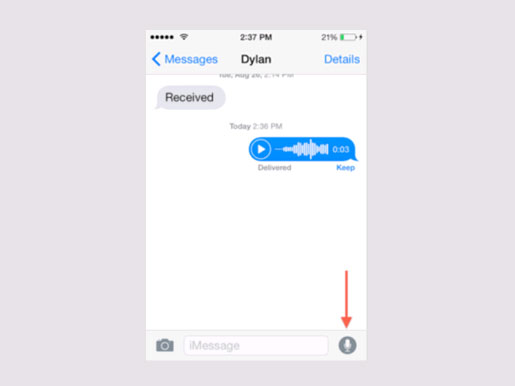 Một tính năng iOS 8 mới khá hấp dẫn là khả năng gửi tin nhắn âm thanh nhanh chóng cho bạn bè. Để bắt đầu, bạn sẽ lưu ý rằng bây giờ có một biểu tượng micro nằm ở góc phải bên dưới của màn hình tin nhắn. Nếu bấm và giữ biểu tượng, nó sẽ mang đến một cửa sổ để tự động bắt đầu ghi âm một tin nhắn âm thanh.