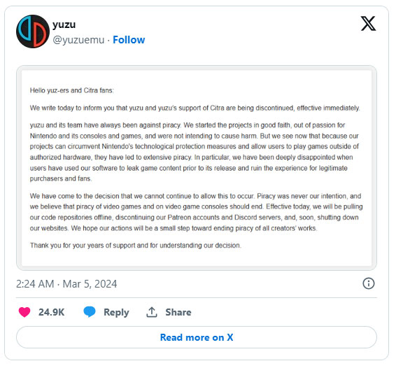 Hơn nữa, Tropic Haze đã ngừng hỗ trợ vĩnh viễn Yuzu và trình giả lập 3DS của nó có tên Citra ngay lập tức. Tài khoản Yuzu chính thức trên X (trước đây là Twitter) đã đăng tải thông báo. Trong đó, họ xác nhận việc ngừng phát triển các trình giả lập ngay lập tức và tuyên bố phần mềm của họ đã vô tình làm phát sinh vi phạm bản quyền.