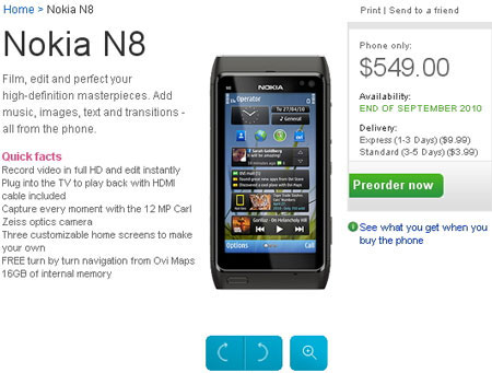 Nokia đã bắt đầu cho phép người dùng tại Mỹ đặt mua “siêu phẩm” smartphone N8 của họ với giá 549 USD. Máy sẽ được giao vào cuối tháng 9.