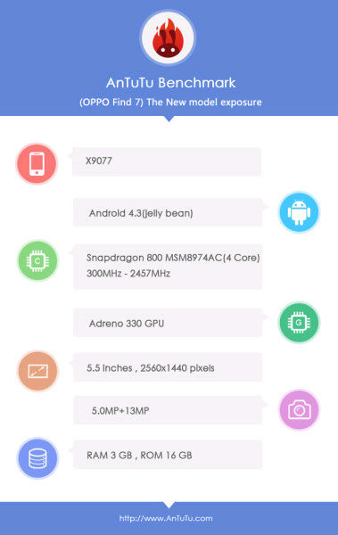 Theo thông tin từ trang GsmArena, chiếc Oppo Find 7 của công ty OPPO (Trung Quốc) vừa lộ một ảnh và thông số kỹ thuật. Sản phẩm này sẽ có hai phiên bản, bao gồm phiên bản màn hình full HD và phiên bản màn hình 2K.