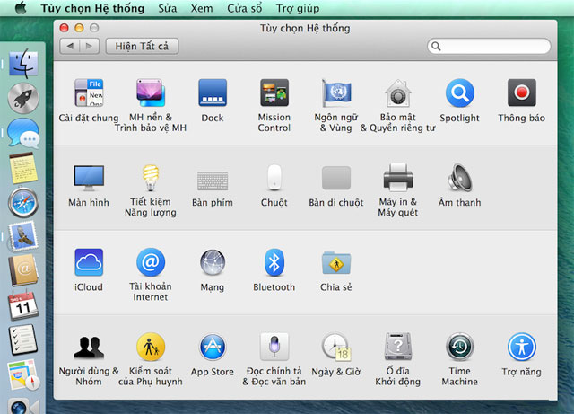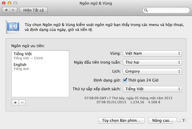 Để kích hoạt giao diện tiếng Việt thì bạn vào System Preferences -> Language & Text và chọn Ngôn ngữ Việt Nam.