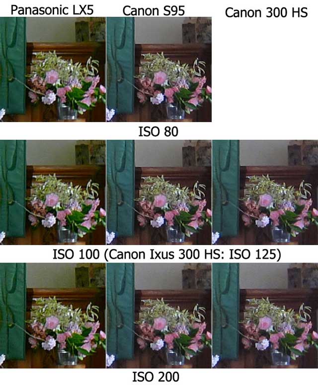 Tại mức ISO dưới 200, ảnh cho bởi cả ba máy đều rất mịn và nét. Lưu ý, IXUS 300 HS không có thiết lập ISO 80. Cân bằng trắng trên hai sản phẩm của Canon có xu hướng ngả về xanh lam. Trong khi đó, màu sắc trên Panasonic LX5 lại thiên về gam xanh lục và cũng rực hơn so với S95 và 300 HS. Tại mức phóng đại 100%, người xem có cảm giác LX5 lấy nét hơi "out" một chút nên hầu như không tách bạch được các chi tiết nhỏ trên lá cây, cánh hoa... Ống kính của S95 cho độ nét tốt nhất trong cả ba model.