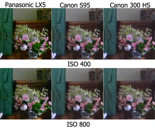 Tại mức ISO 400 và 800, nhiễu bắt đầu có thể nhận ra tại các vùng ảnh tối trên cả ba model. Thuật toán khử nhiễu trên LX5 khiến ảnh trở nên khá mịn màng nhưng lại làm giảm độ nét và gây nên hiện tượng kết tủa gam xanh lục tại mép bàn phía sau chậu hoa. Mặc dù sở hữu công nghệ cảm quang BSI ưu việt nhưng do có kích thước khiêm tốn nên Ixus 300 HS không thể tái hiện được tốt các chi tiết tại ISO 800. Ảnh hơi xỉn và lấm tấm những hạt sạn nhỏ. Một số pixel bị vỡ làm ngừơi xem có cảm giác hơi tức mắt. Canon S95 cho ảnh không được trong như LX5 nhưng có lẽ là tốt nhất trong cả ba máy do cân bằng tốt giữa khử nhiễu và giữ lại các chi tiết.