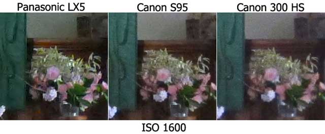 Khi nâng ISO lên 1600, lượng nhiễu tăng đột biến trên cả ba máy. Ảnh cho bởi IXUS 300 HS trông như bị phủ một lớp sương mờ. Thuật toán khử nhiễu làm việc mạnh khiến ảnh trở nên hơi xỉn và mất nhiều chi tiết. Canon S95 và Panasonic LX5 khá hơn một chút do vẫn giữ lại được độ nét và dải tương phản động. Nhiễu của S95 ở dạng lấm tấm và phân bố đều trên ảnh. Ngược lại, ảnh của LX5 trông rất mịn nhưng thỉnh thoảng lại bị những chấm sạn lớn và xảy ra hiện tượng bết màu tương đối nặng. Khi chuyển về lưu dưới dạng RAW, S95 và LX5 khá tương đồng về mật độ nhiễu hạt cũng như số chi tiết nhỏ thể hiện được trên ảnh.