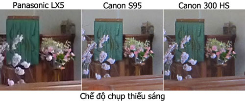 Ba máy đều cung cấp mức nhạy sáng ISO 3200 và thậm chí cao hơn nữa. Tuy nhiên, chất lượng ảnh thu được hầu như không đáng chú ý do lượng nhiễu quá lớn và bị mất nhiều chi tiết. Tại chế độ riêng dành cho việc chụp ảnh thiếu sáng (High Sensitivity Mode đối với LX5 và Low Light Mode đối với S95/300 HS), độ phân giải của ảnh giảm xuống rõ rệt. Bù lại, ảnh trông đỡ nhiễu hơn hẳn và cũng dễ xem hơn dù rằng, một lượng lớn các chi tiết đã bị mất.
