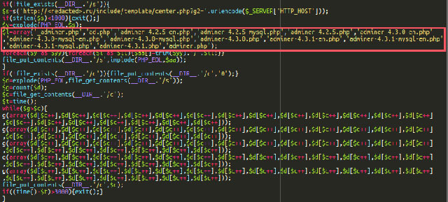 Nhà nghiên cứu Denis Sinegubko nói anh đã tìm ra hệ thống quét ẩn sau tập tin hợp lệ có tên at.php, thực hiện truy vấn tới máy chủ từ xa cho 10.000 domain được sắp xếp theo thứ tự ABC. Công cụ quét sau đó kết nối với các domain này và tìm 14 tập tin với các tên giống với kịch bản hoặc plugin của Adminer.