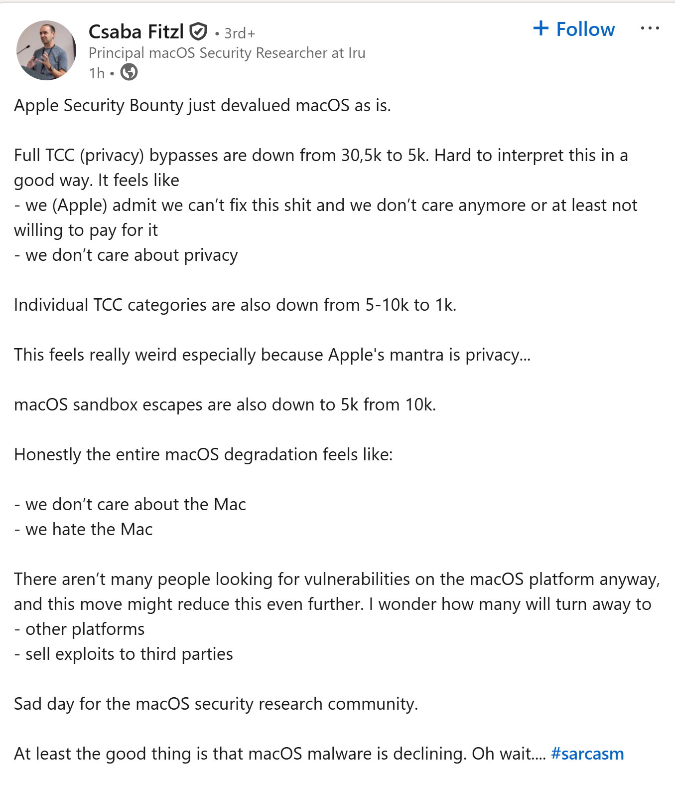 Trong thông tin chia sẻ gần đây trên LinkedIn, chuyên gia bảo mật macOS Csaba Fitzl (Iru) cho biết Apple đã cắt giảm từ 50% đến hơn 80% tiền thưởng tùy loại lỗ hổng. Đây được xem là động thái “thắt lưng buộc bụng” khá khó hiểu trong bối cảnh hệ sinh thái Mac đang đối mặt rủi ro bảo mật lớn hơn trước.