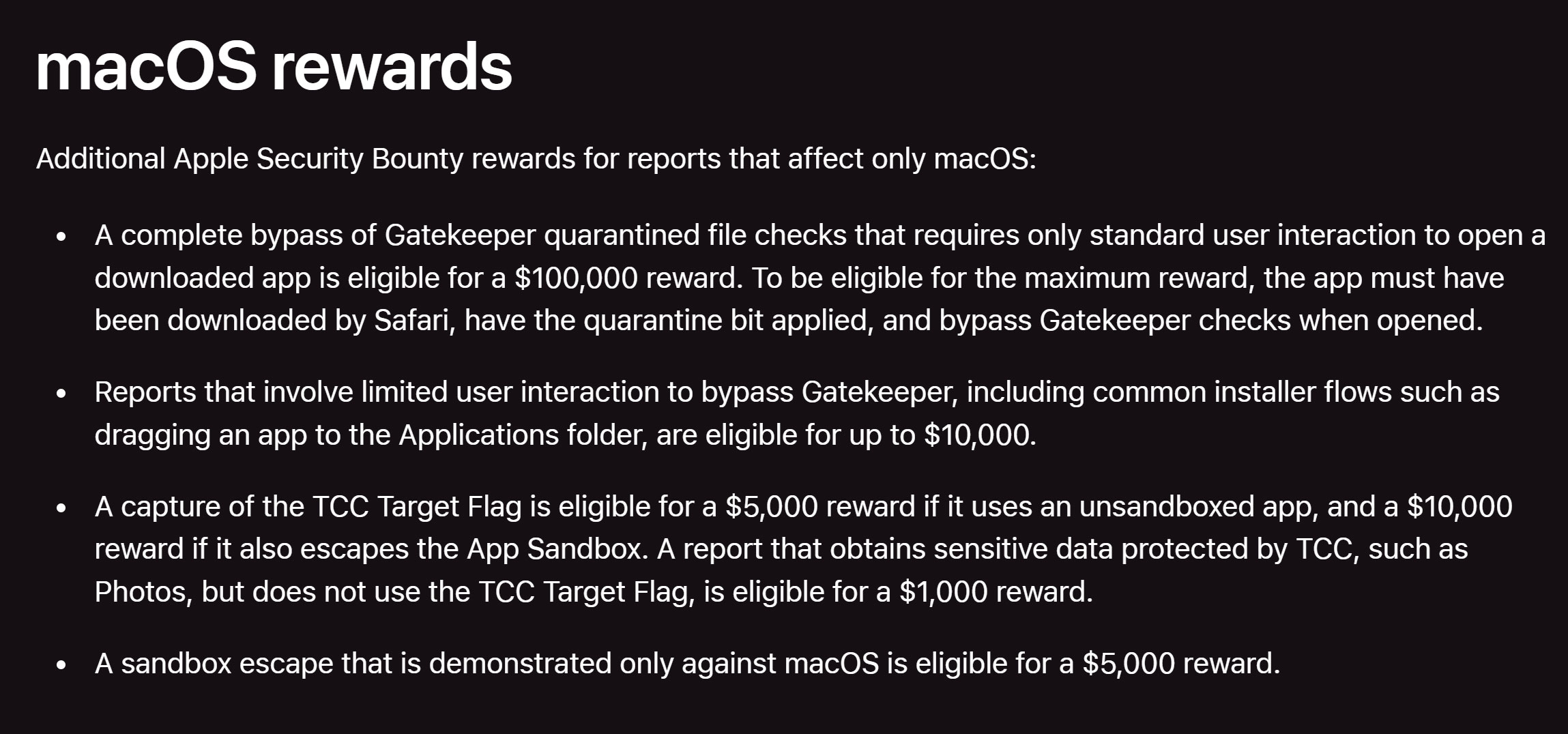 Một dạng lỗ hổng khác, cho phép truy cập dữ liệu thuộc phạm vi bảo vệ của TCC (ví dụ ảnh trong Photos) nhưng không dùng cờ TCC Target Flag, giờ chỉ được thưởng 1.000 USD. Tất cả mức thưởng mới đều được Apple công khai trên trang chương trình bounty của hãng.