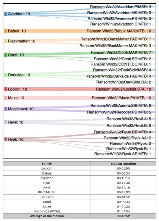 Để giải đáp vấn đề này, trang Splunk đã thực hiện một bài thử nghiệm với tổng số 400 lần để kiểm tra tốc độ mã hóa file của 10 ransomware khác nhau lây lan trên internet. Ransomware được thử nghiệm bao gồm REvil , Darkside, Babuk, Maze, LockBit và một số ransomware khác trên cả phiên bản Windows 10 và Windows Server 2019.