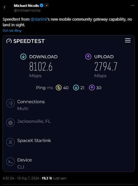 Công ty Internet vệ tinh SpaceX của tỷ phú Elon Musk đã “nhá hàng” loạt kết quả đánh giá tốc độ truyền tải dữ liệu cực kỳ ấn tượng, khoe rằng đường truyền Internet được cung cấp từ không gian của công ty có thể mang lại tốc độ tải xuống (download) đáng kinh ngạc là 8Gbps ở một địa điểm xa xôi. Phó chủ tịch Starlink Engineering, Michael Nicolls, đã chia sẻ kết quả kiểm tra tốc độ mới nhất trên nền tảng mạng xã hội X: