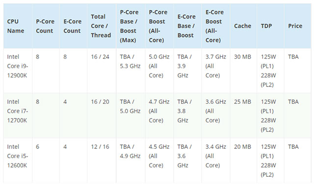 Dưới đây là thông số kỹ thuật "tin đồn" của các mẫu CPU desktop Intel thế hệ thứ 12 Alder Lake: