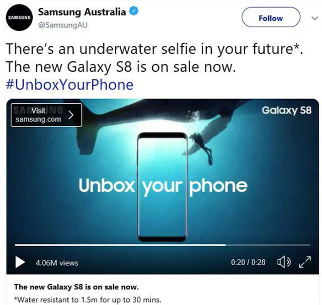 Trước đó, gã khổng lồ công nghệ Hàn Quốc đã phát hành tổng cộng 8 video quảng cáo, trong đó tuyên bố rằng các mẫu smartphone Galaxy S7, S7 Edge, A5 (2017), A7 (2017), S8, S8 Plus và Note 8 của hãng có thể dùng được trong bể bơi hoặc khi tắm biển. Tuy nhiên, kết quả thực tế lại không được như vậy.