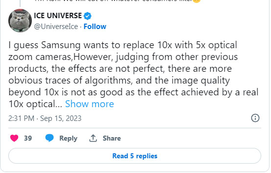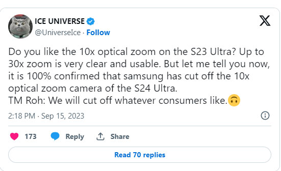 Tuy nhiên, thật khó để tin rằng Samsung sẽ loại bỏ thứ gì đó đã mang lại lợi thế cho họ so với các đối thủ như Apple, OPPO, Vivo và Xiaomi. Để so sánh thì hầu hết các mẫu điện thoại thông minh cao cấp cạnh tranh khác, bao gồm cả iPhone 15 Pro Max mới ra mắt gần đây đều có camera tele với khả năng zoom quang 5x. Samsung là thương hiệu điện thoại thông minh duy nhất cung cấp camera tele với zoom quang 10x, và nếu họ bổ tính năng này, lợi thế cạnh tranh của sản phẩm có thể ảnh hưởng nghiêm trọng.
