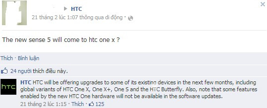 "HTC sẽ cung cấp bản nâng cấp cho một số thiết bị hiện có của mình trong vài tháng tới, bao gồm các phiên bản của HTC One X, One X+, One S và HTC Butterfly. Ngoài ra, cũng lưu ý rằng một số tính năng có sẵn cho HTC One mới sẽ không bao gồm trong các bản cập nhật"