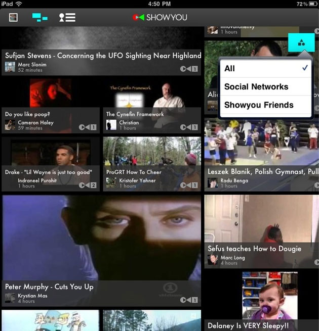 Nếu bạn đã từng sử dụng các ứng dụng mới dành cho iPad như Flipboard, bạn sẽ ngay lập tức quen thuộc với khái niệm Showyou. Ứng dụng này cho phép bạn kết nối với tài khoản Facebook và Twitter và cho bạn thấy một danh sách các video trực tuyến nổi tiếng dựa trên những video mà các bạn của bạn chia sẻ nhiều nhất và những video nhận được nhiều phản hồi nhất tại bất cứ thời điểm nào.