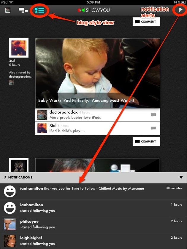 Ngoài định dạng theo kiểu mạng lưới, bạn cũng có thể xem danh sách các Video từ Showyou theo phong cách Blog (hay theo phong cách trên tường của Facebook) ngược với thứ tự theo thời gian, bằng cách nhấn vào biểu tượng thứ 3 ở phía bên phải của giao diện người dùng. Giao diện này cho phép bạn thấy mọi hoạt động của bạn bè trên Showyou khi họ đăng tải video hay bình luận một video khác. Một biểu tượng lá cờ nhỏ ở phía trên bên phải cho bạn biết nếu bạn có bất cứ thông báo nào, khi bạn có bạn mới trên Showyou hay khi họ bình luận và cảm ơn bạn đã đăng tải một video thú vị.